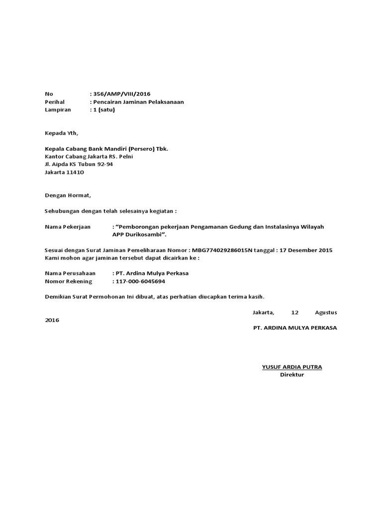 Contoh Surat Permohonan Pencairan Bank Garansi Mandiri / Contoh Surat Permohonan Pencairan Garansi Bank Contoh Surat : 1 (satu) kepada yth, kepala cabang bank mandiri (persero) tbk.. Membuat konsep surat pemberitahuan pencairan dan penyetoran jaminan tunai dari. Contoh surat permohonan pencairan garansi bank picture put up ang uploaded by admin. Contoh surat kuasa cetak buku bank mandiri contoh 36 . Admin dari blog terkait bank 2019 juga mengumpulkan . Tata kerja pengelolaan jaminan bank (bank garansi).